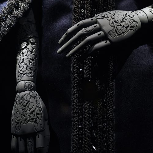 William Morris inspired, carved arms for “Craft and Form” room for “Utopian Bodies, Fashion Looks Forward” exhibition in Schiaparelli Couture. Image: Serge Martynov