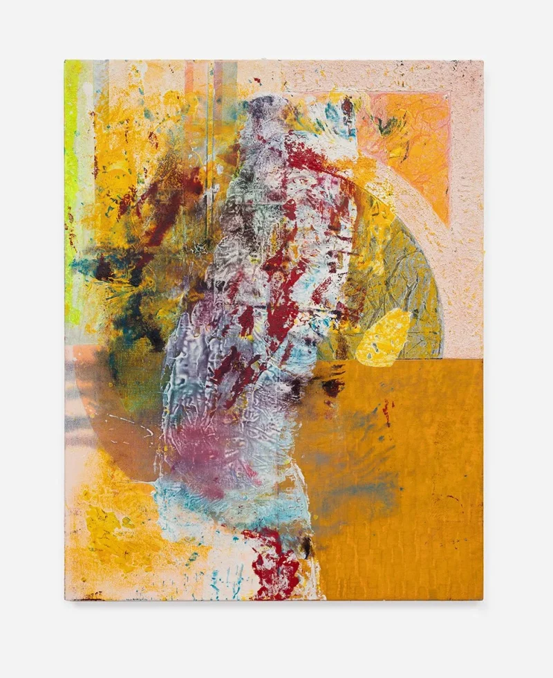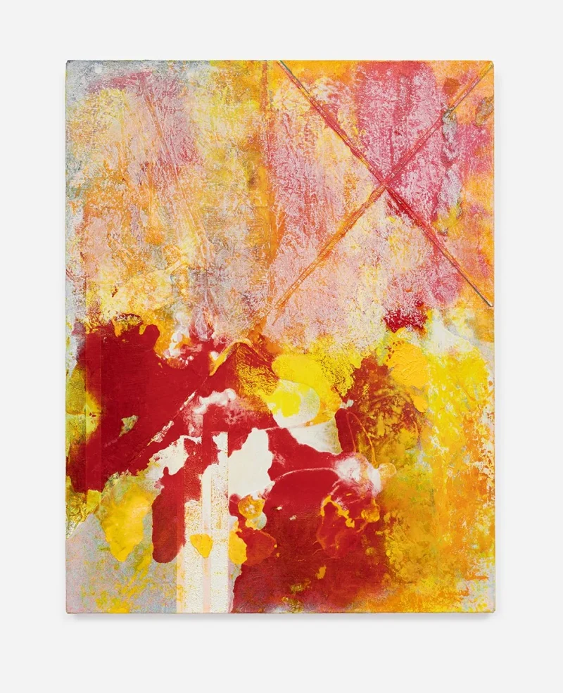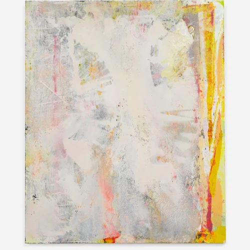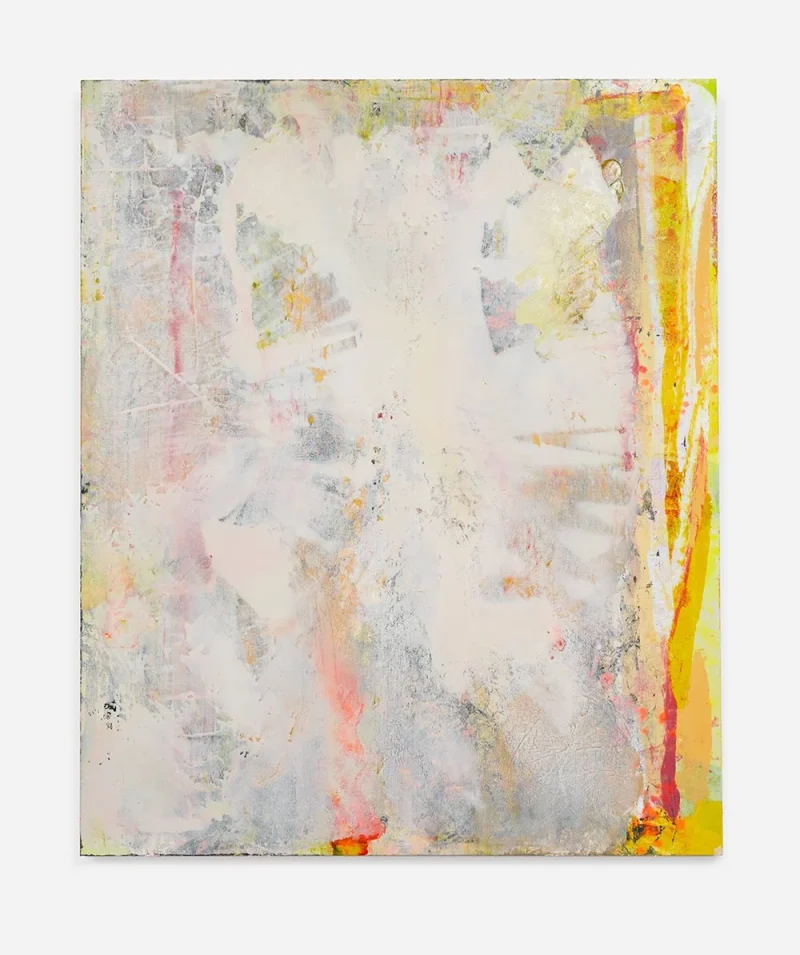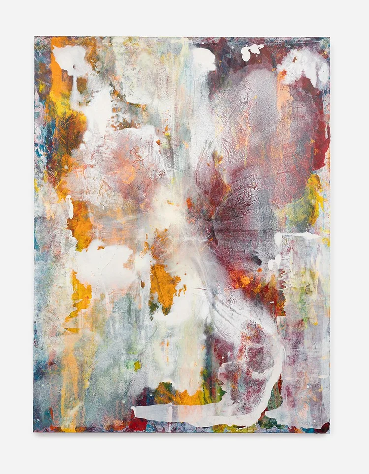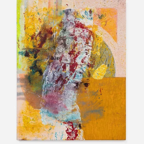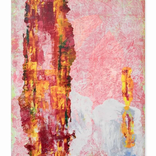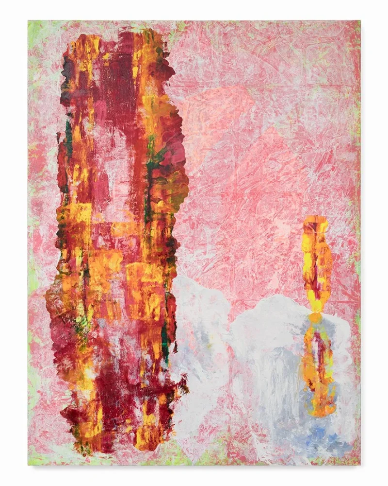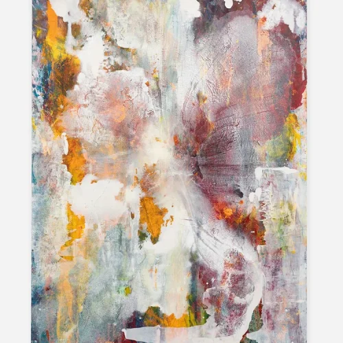 These new works point to the presence of the body. Colors are no longer separated by distinct lines; shapes move, change and morph. They are a synthesis of gently responding and violently reacting to each other. “I approach the canvas very physically, applying paint in ways that extend and challenge my body: moving the canvas from the wall to the floor, and pressing the oil paint into the surface to disrupt the surface with whatever is at hand in the studio – an old t-shirt, plastic wrap or edge of cardboard.”